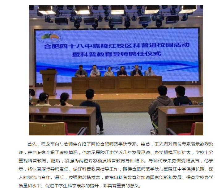 本网讯 5月12日下午,合肥四十八中嘉陵江校区(简称:嘉陵江中学)科普进校园活动暨科普教育导师聘任仪式在嘉陵江中学蕴华楼五楼报告厅举行。yl6776永利集团生命科学学院欧祖兰副教授和朱勇副教授应邀开展科普教育活动,并受聘为嘉陵江中学科普教育导师。嘉陵江中学校党支部书记、校长凌强,副校长王光海出席活动,活动由生命科学学院副教授、嘉陵江中学挂职副校长王占军搭建合作平台,嘉陵江中学科研处主任程龙军主持导师聘任仪式。