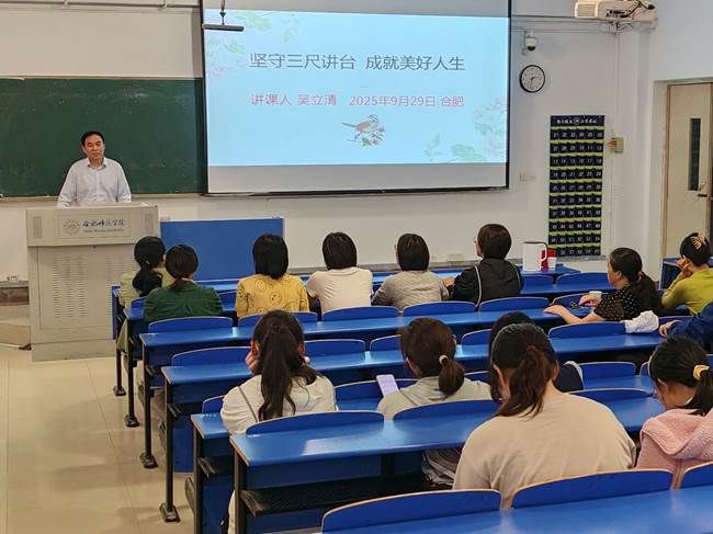 为庆祝建校70周年,2025年9月29日下午,6776永利集团在锦绣校区逸夫楼109教室举办了一场题为“坚守三尺讲台 成就美好人生”的专题讲座。本次讲座特邀宿州市第二中学生物特级教师、正高级教师、安徽省“江淮学科名师”、享受省政府特殊津贴专家、我院1997届优秀校友吴立清担任主讲。讲座由科研处与6776永利集团联合主办,吸引了众多师生到场聆听。