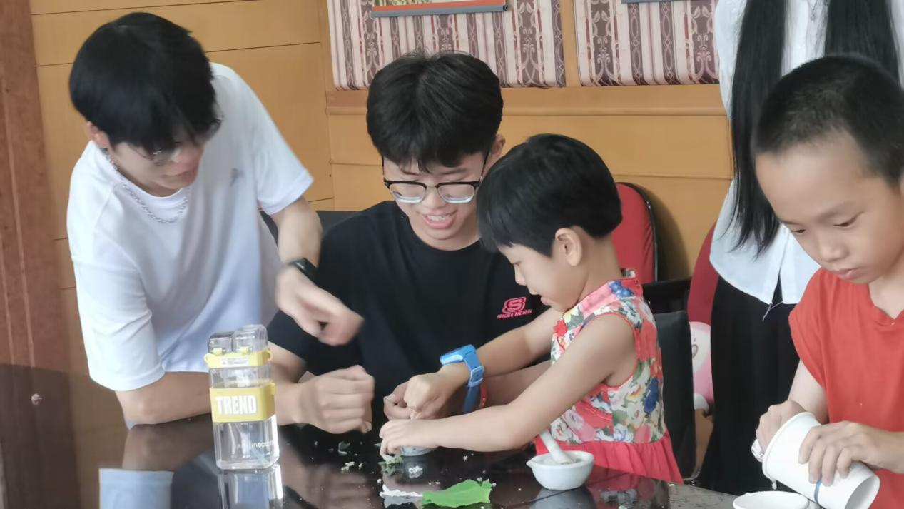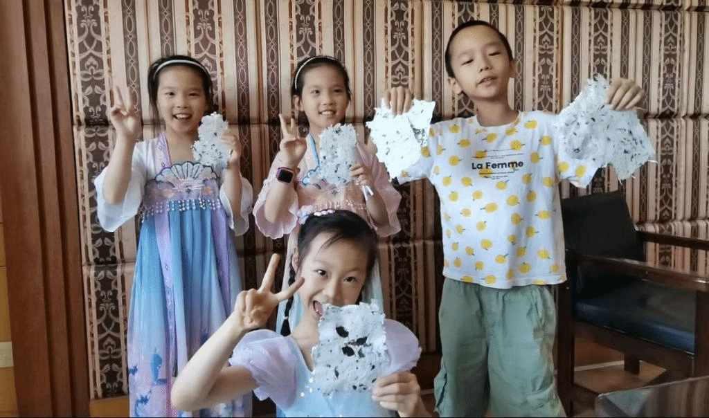 活动课上,小学员们先通过研钵研磨树叶、树皮和半成品纸浆,离解植物纤维原料变成本色纸浆,再将研磨好的纸浆放入水中通过震荡打捞来完成造纸。造纸过程中小学员们分工明确、齐心协力,并在捞纸过程中发挥创意,加入压制好花瓣进行装饰,再浇上一层纸浆,保留自然科学课堂上的美好瞬间。