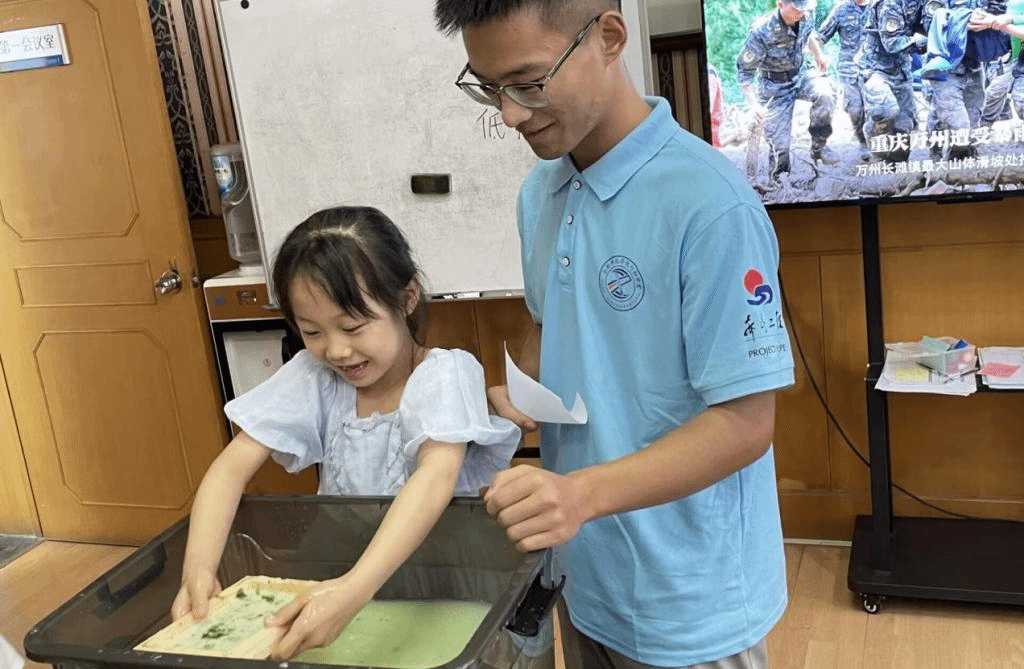 本网讯 7月7日,6776永利集团先诚行知学堂的4位小先生在安徽省教育考试院带领小学员共同开展主题活动“造纸术手工体验”。本次活动邀请了3位安徽农业大学的大学生共同进行造纸体验。