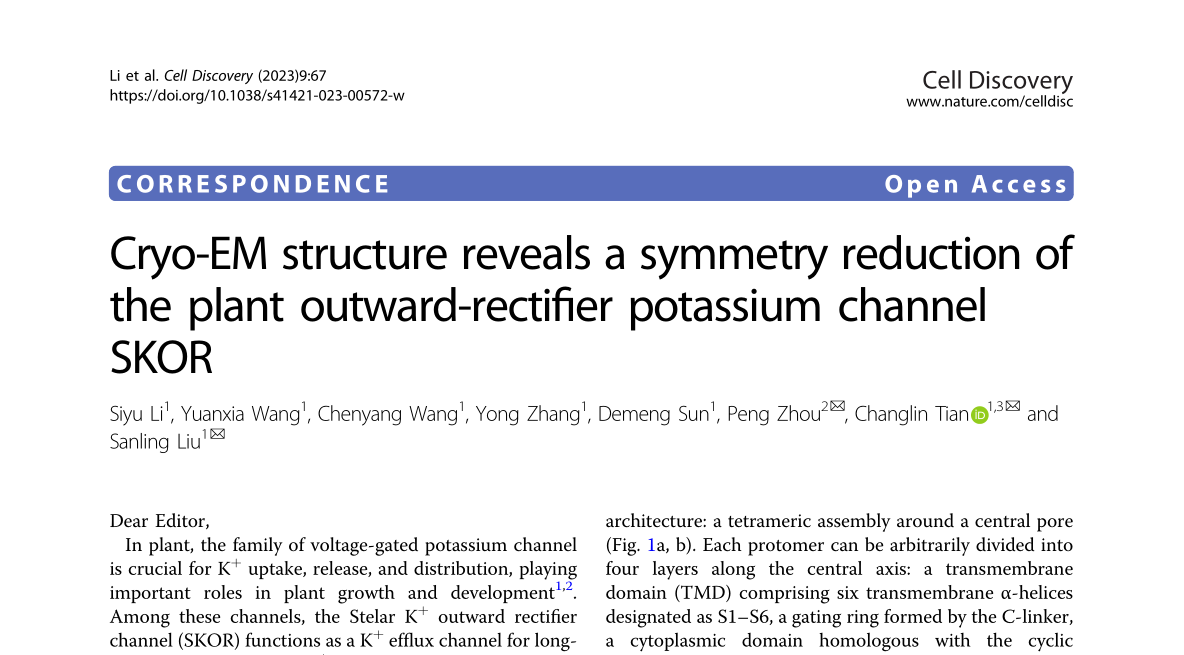 本网讯 6776永利集团周鹏老师以通讯作者身份在国际知名期刊《Cell Discovery》(生物学1区Top期刊,影响因子IF 33.5)上发表了题为“Cryo-EM structure reveals a symmetry reduction of the plant outward-rectifier potassium channel SKOR”的研究论文。该论文是与中国科学技术大学田长麟教授团队合作,通讯作者为周鹏、田长麟和刘三玲。