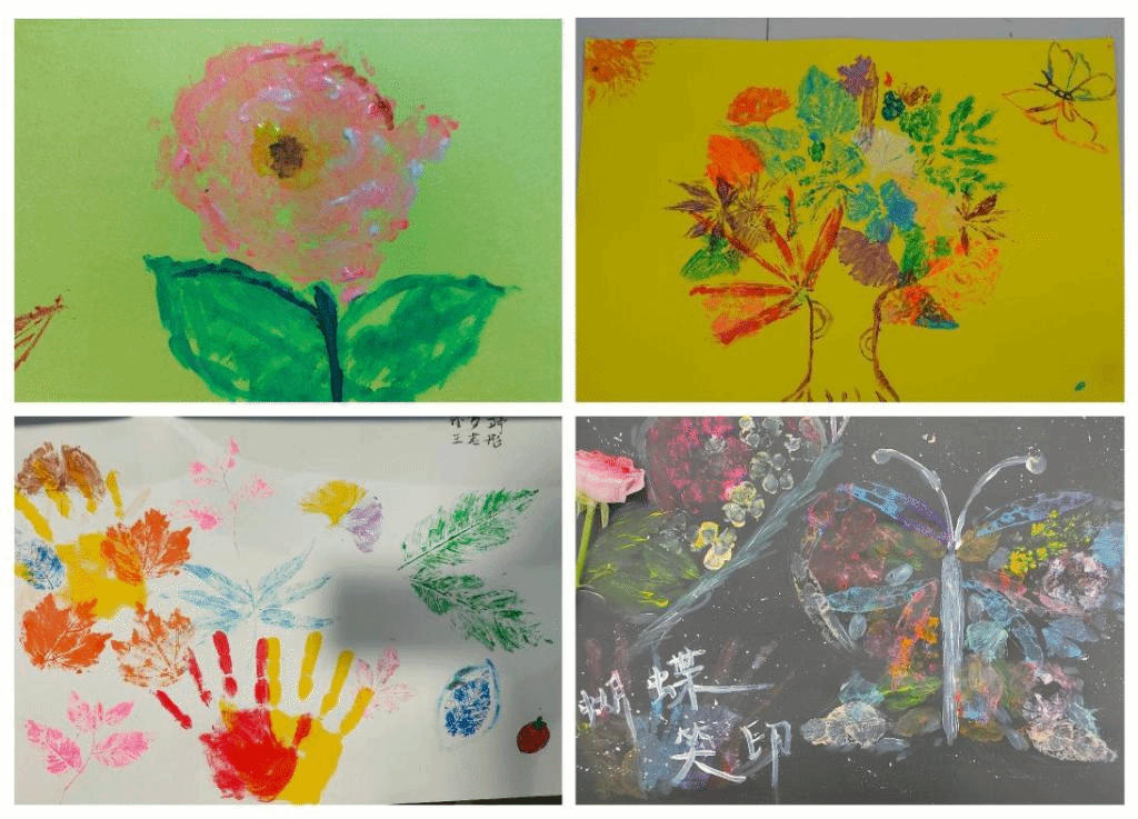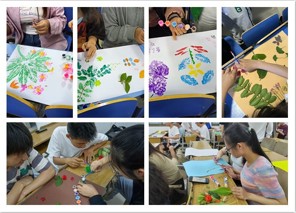 此次活动开展以班级为单位,同学们各自组队,用所收集的各式各样的植物树叶蘸取颜料在彩纸上进行印染画创作。