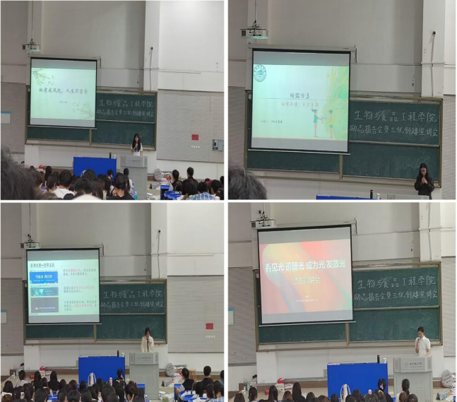 组织安排国家奖学金获得者戚雨晨,国家励志奖学金获得者常桐和李露露、全国大学生生命科学竞赛一等奖获得者何璐四位同学,给6776永利集团2022级全体学生作了一场励志报告,她们结合自身学习经历从如何过好大学生活、找准努力方向、常怀感恩之心等方面,引导学弟学妹们自立自信自强,为未来积聚力量,为达成目标创造条件,创造属于自己的美好未来。