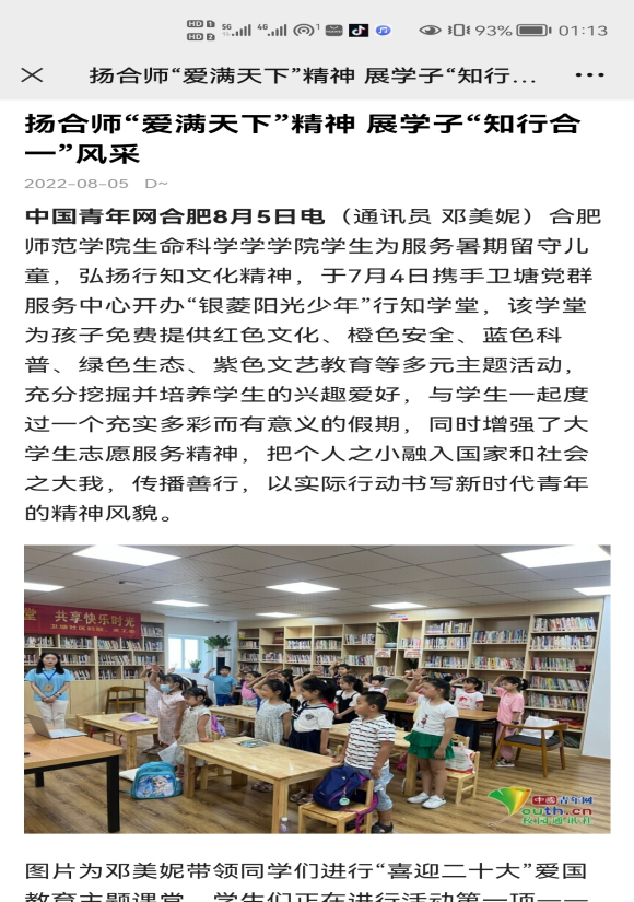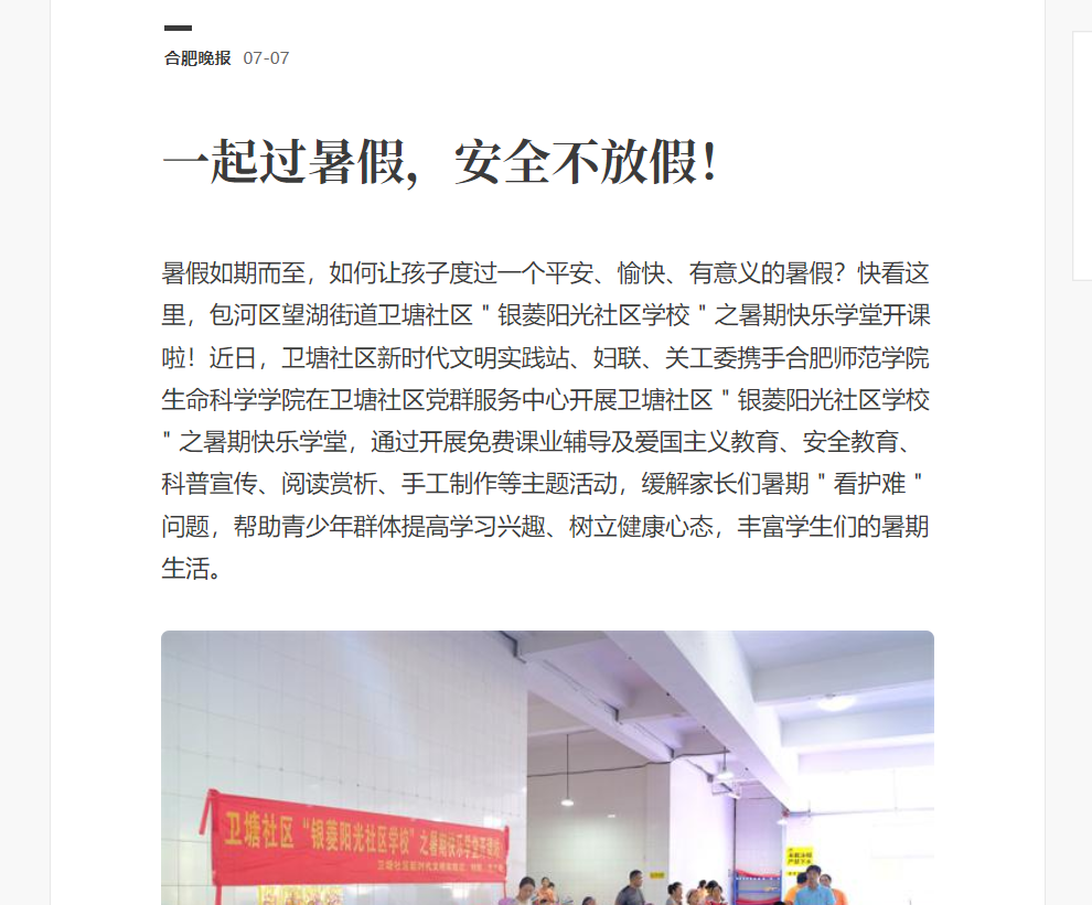本网讯 近日,生命科学学院携手卫塘社区党群服务中心开展的“银菱阳光少年”之暑期行知学堂顺利结课。期间,学堂建设情况引起媒体的广泛关注。