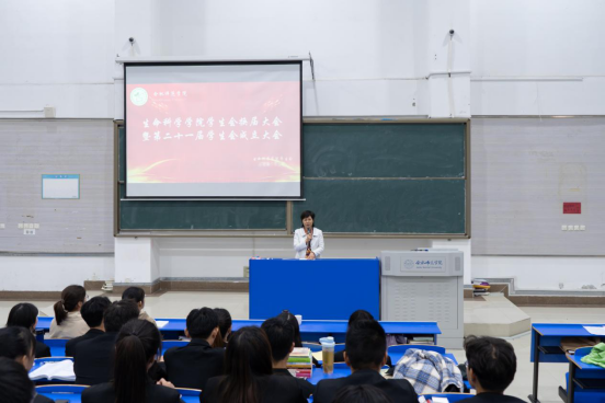 会议最后,郭桃芬发表总结讲话。她首先对同学们入选为我院学生会干部表示热烈的祝贺。她指出学生会干部既是一种荣誉,更是一种责任。希望同学们坚持党的领导和团的指导,加强政治理论学习,提高思想境界,锤炼品德修为。其次,学生会成员来源于学生,代表学生,服务学生,要积极贯彻“自我教育,自我管理,自我服务”的“三自”工作理念,以服务为核心,务实创新;充分发挥模范带头、桥梁纽带、核心骨干三大作用;要有大局意识,各部门明确部门职责定位,有效分工,充分合作,做到分工不分家;学生会成员要正确处理好工作和学习、个人和团队、个人付出和荣誉获得的关系。同时,期待新一届的学生会传承上届学生会的优良作风和取得的成果,再接再厉,锐意进取,取得更加辉煌的成果。