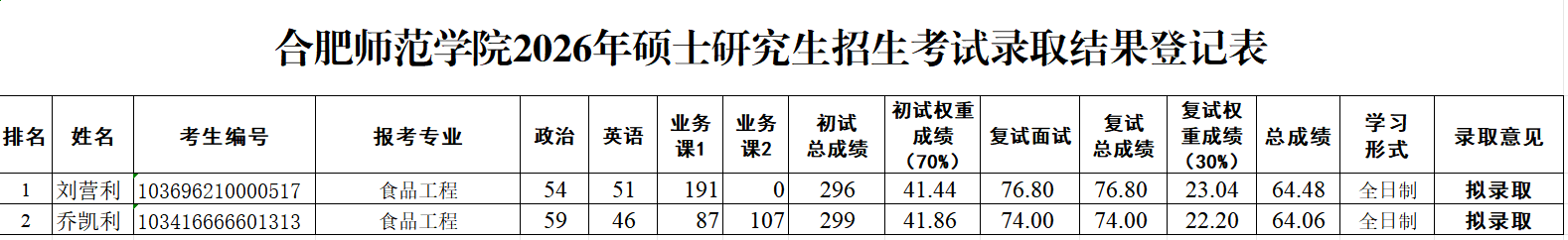 2026年硕士研究生招生(第三轮调剂)拟录取结果: