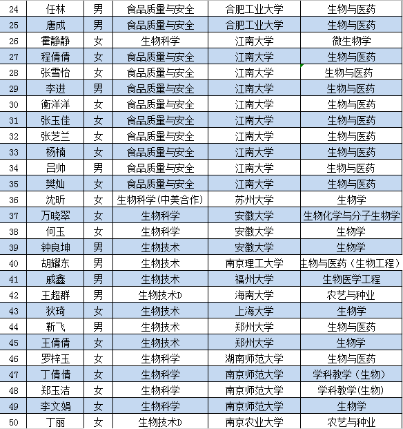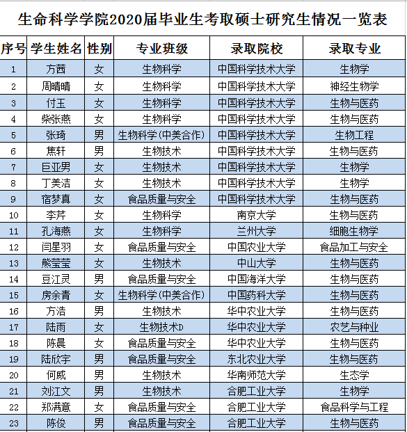 331名毕业生中有90名被国内外高校录取,国内升学87名,国外升学3名,总体录取率达27.2%,其中考取“985”、“211”高校51人,占比57%,9名毕业生报考中国科学技术大学全部被录取,其中生物科学专业方茜同学斩获中科大生物学专业综合成绩第一名。另外还有李芹、任林、孔海燕3名同学分别斩获南京大学生物与医药专业第一名、合肥工业大学生物与医药专业第一名、兰州大学细胞生物学专业第一名。在考取研究生的同学中,统招生(不含对口招生和中美合作专业)考研率达37%,再创生命科学学院历史新高。首届对口招生的生物技术毕业生96人,考取研究生7人,其中3人为“211”建设高校,成绩亦是喜人。