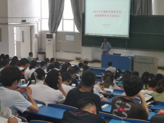 本网讯 6月15日中午12:30,生命科学学院在逸夫楼西阶梯教室3召开2021学年动植物学野外实习动员大会,生科院院长徐忠东、副院长朱桂兰及实习相关指导教师和辅导员黄洁出席了会议,全体2019级和2020级生物科学专业学生参加了动员会。会议由实习实训中心主任沈章军主持。