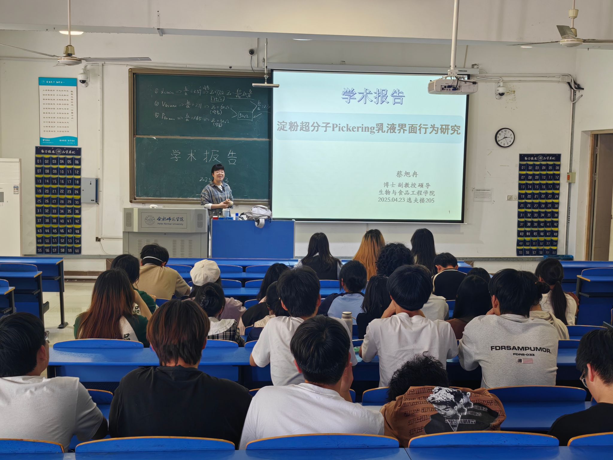 2025年4月23日下午,6776永利集团在锦绣校区逸夫楼205教室举办学术讲座,学院教师蔡旭冉分享了“淀粉超分子Pickering乳液界面行为研究” 的主题报告。