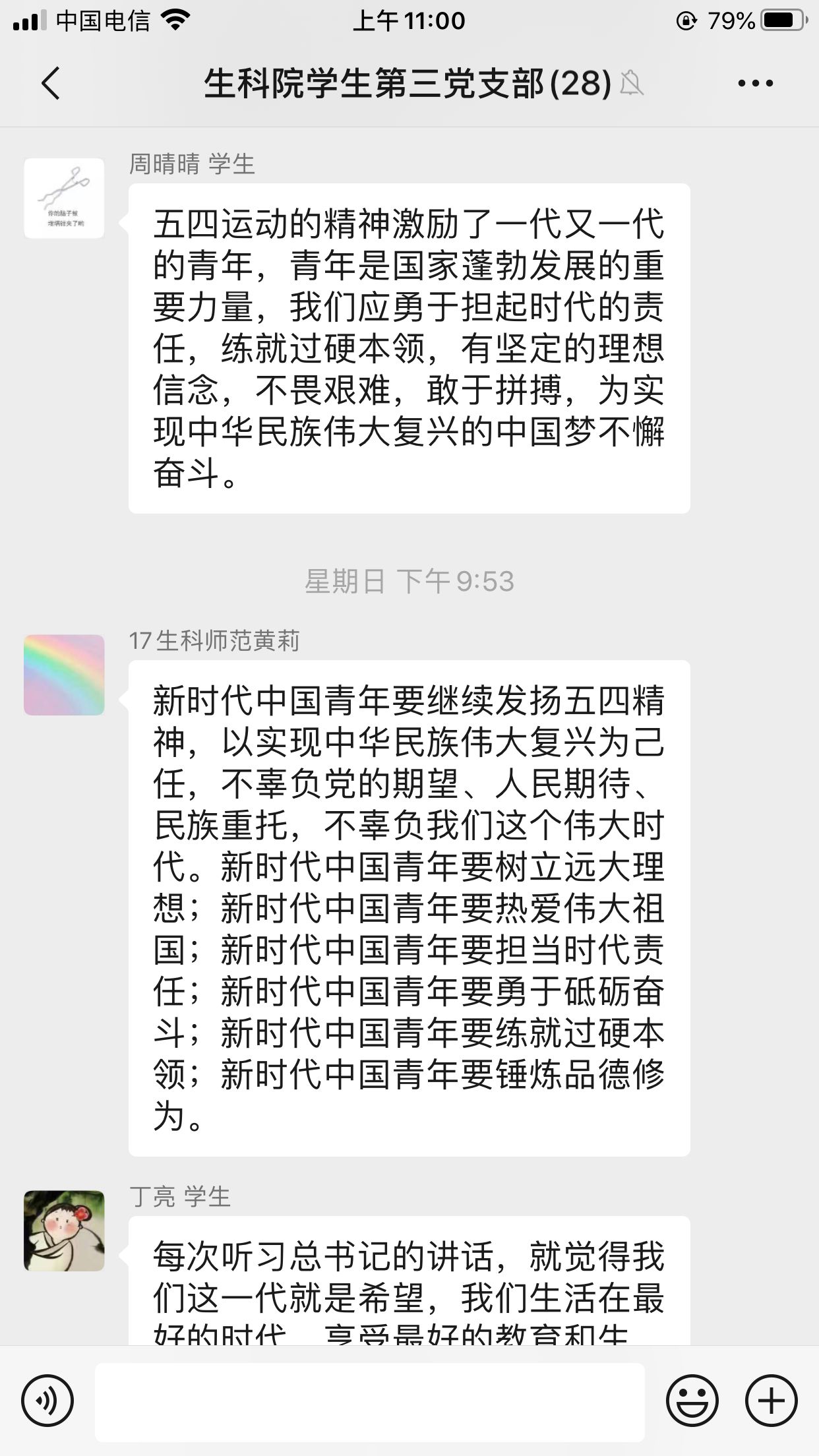 又一个五四青年节来临,今年是五四运动爆发101周年的日子,也是全国疫情防控阻击战取得重大战略成果背景下的青年节。为缅怀历史,学习和弘扬“五四”精神,在五四青年节到来之际,生命科学学院学生第三党支部于5月3日线上开展“五四精神,传承有我”主题党日活动。本次活动由学生第三党支部书记李万成主持。