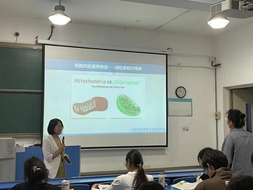 课中,许晓娟老师围绕课程中线粒体和叶绿体的半自主性部分内容进行讲解,巧妙的以学生自身为例子,帮助学生理解课堂知识的同时,增强了学生对父母、对社会的感恩之心;接着,许晓娟以我国生物领域精密科研仪器的卡脖子情况为切入点,引发学生的思考,教育学生关注时事热点,增强学生的爱国意识和社会责任感;随后,又将中国科学家的爱国情怀,责任担当,奉献科学事业的敬业精神等融于课堂教学中。
