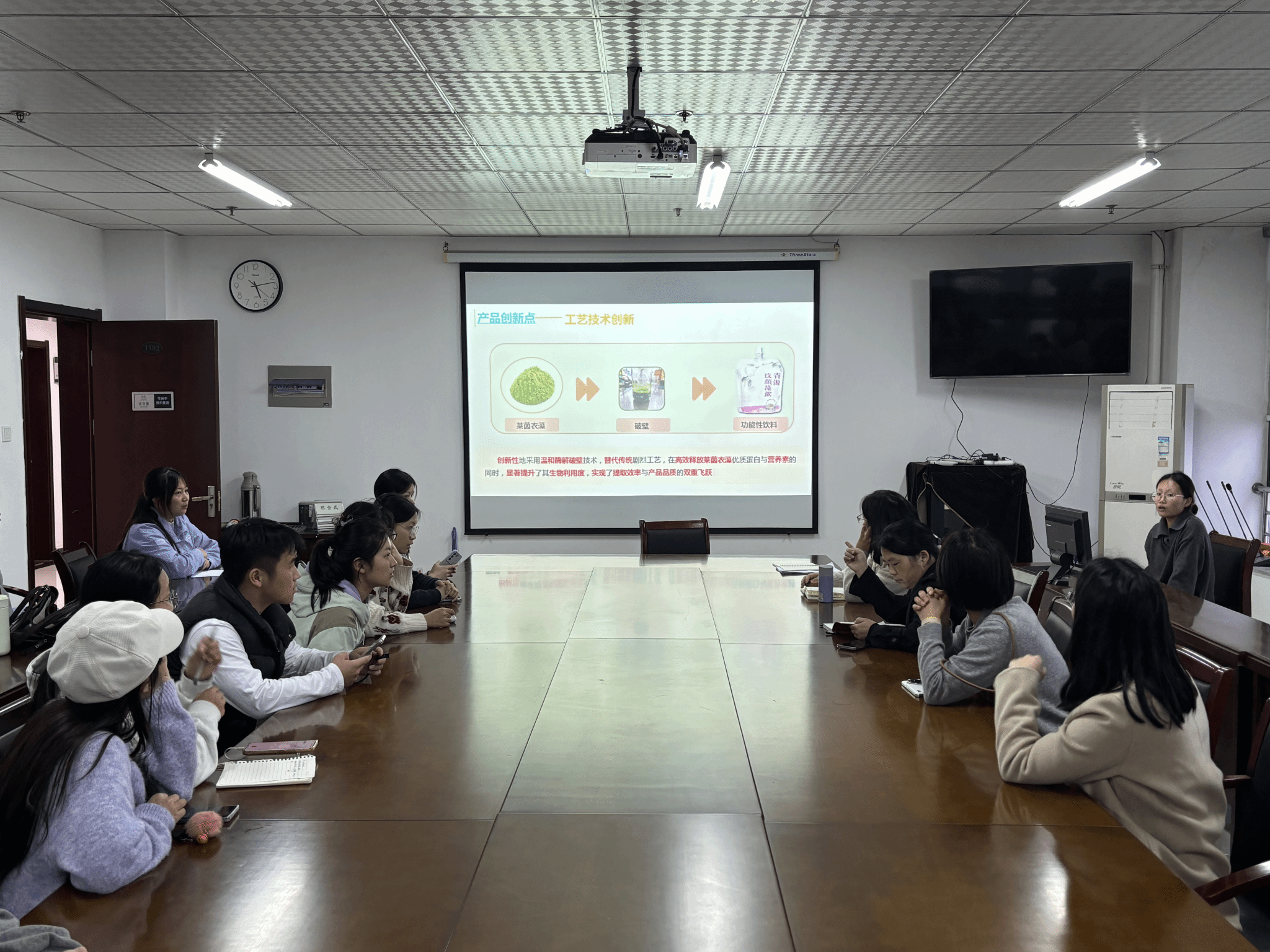 本次赛前打磨会是食品质量与安全教工党支部深化“党建+学科竞赛”融合模式的重要举措,充分彰显了党支部在人才培养中的关键引领作用和党员教师的先锋模范作用。会上,8组参赛团队依次展示了各自的创新作品,涵盖新型藻类饮品、药食同源新茶饮、pH智能酸度指示发酵饮品、微量元素+活性肽口服液、无麸质益生蛋糕、高膳食纤维石斛酸奶杯、植物基轻食塔可、低糖低脂牡丹酥等多个新颖产品,充分体现了学生在食品设计领域的创新思维和实践能力。