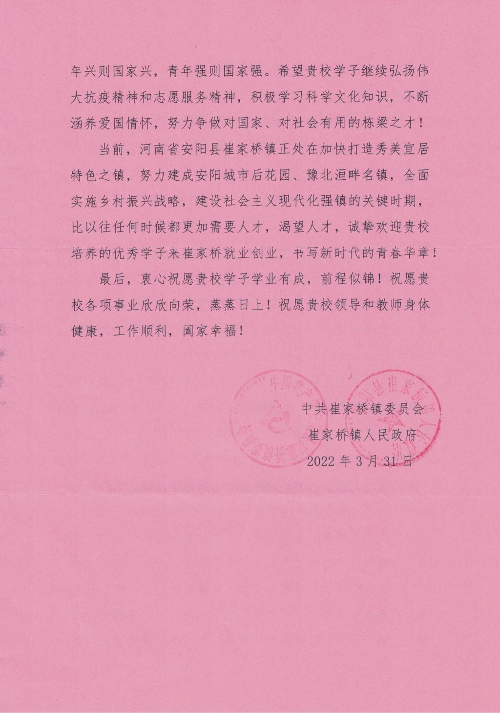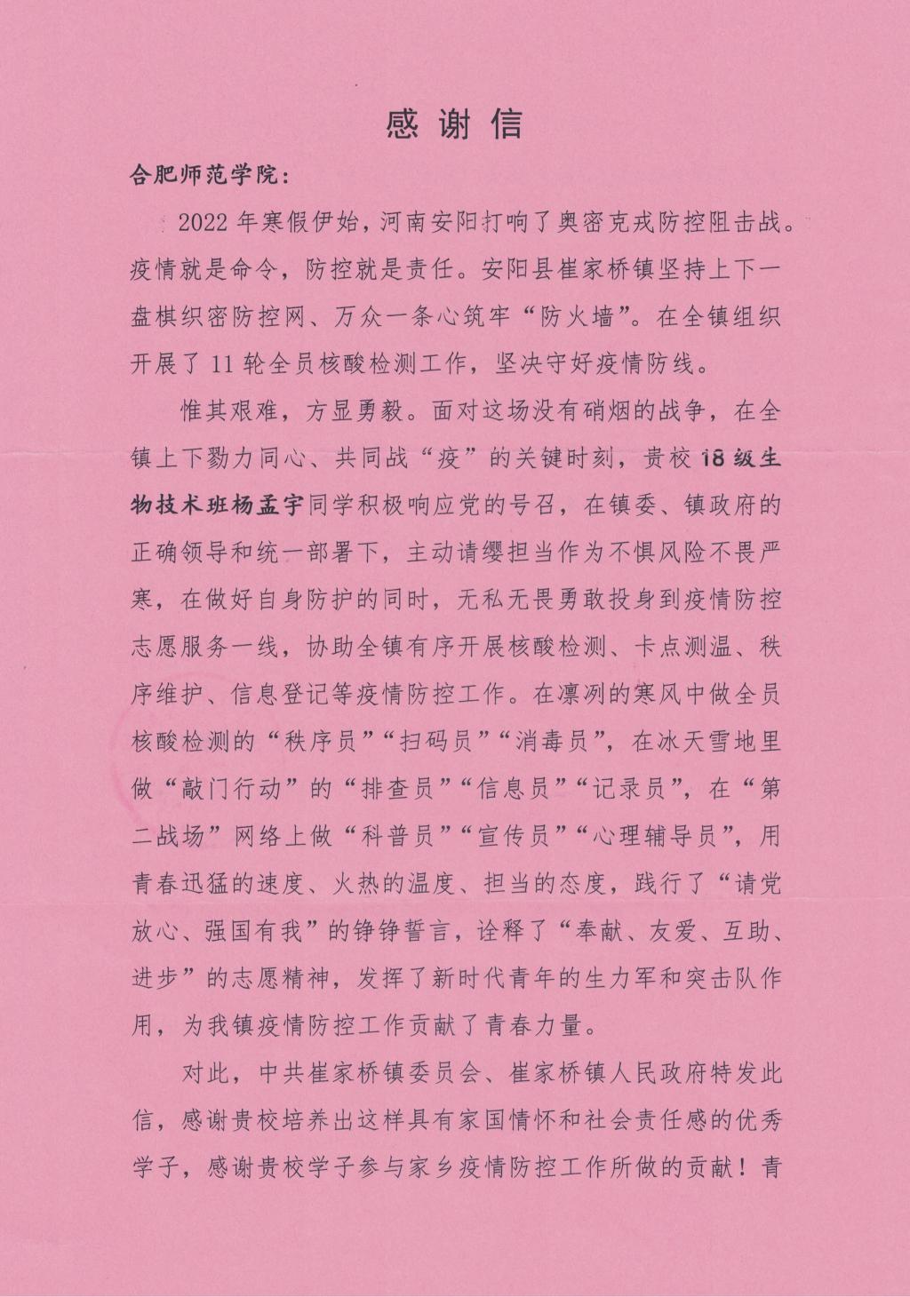 本网讯 近日,yl6776永利集团生命科学学院收到了来自河南省安阳县崔家桥镇的感谢信。信中对18级生物技术班杨孟宇同学不畏艰险、奋勇向前,积极投身家乡的疫情防控志愿服务表达了诚挚的感谢和崇高的敬意。