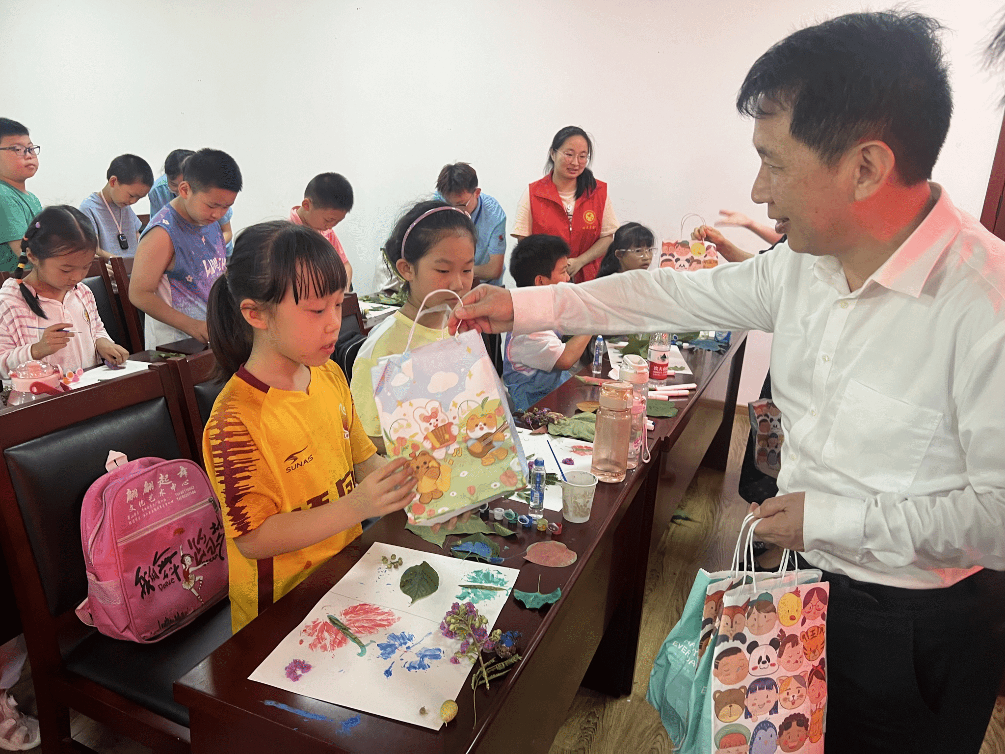 徐文林一行饶有兴致地观看了动植物标本制作课程,对小学员们的创新思维给予高度赞扬,并为小学员们发放了文具礼品和消暑西瓜,鼓励小学员们好好学习,天天向上。慰问活动在一片欢声笑语中圆满落下帷幕,在最后的集体合照环节,小学员们纷纷展示自己的作品,与大家分享自己的创作心得和感受。