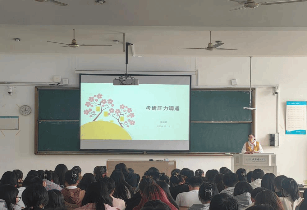 会议伊始,李晶晶以生动的案例和深入浅出的讲解,为学生们剖析了考研压力的来源,并传授了一系列实用的心理调试方法。从培养正确的认知到给自己积极的心理暗示,从放松训练到科学饮食,从寻求社会支持到学会自我减压,每一个建议都如同温暖的阳光,帮助学生们驱散心中的紧张和焦虑情绪。